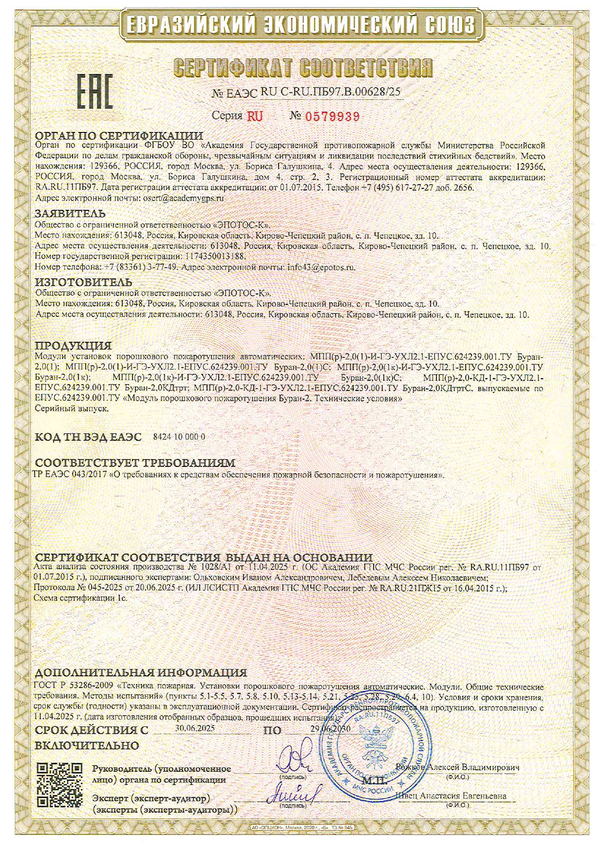 Буран-2,09 500.- руб.есть в наличии Модуль установок порошкового пожаротушения автоматических Буран-2,0 (далее по тексту модуль) предназначен для локализации и тушения пожаров классов А, В, С, а также E (пожары горючих веществ и материалов электроустановок, находящихся под напряжением, параметр пробивного напряжения не учитывается согласно п. СП 485.1311500.2020).